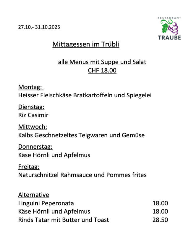 Für Reservierungen rufen Sie uns an unter +41712225897 oder schreiben Sie an info@speiserestaurant-traube.ch.